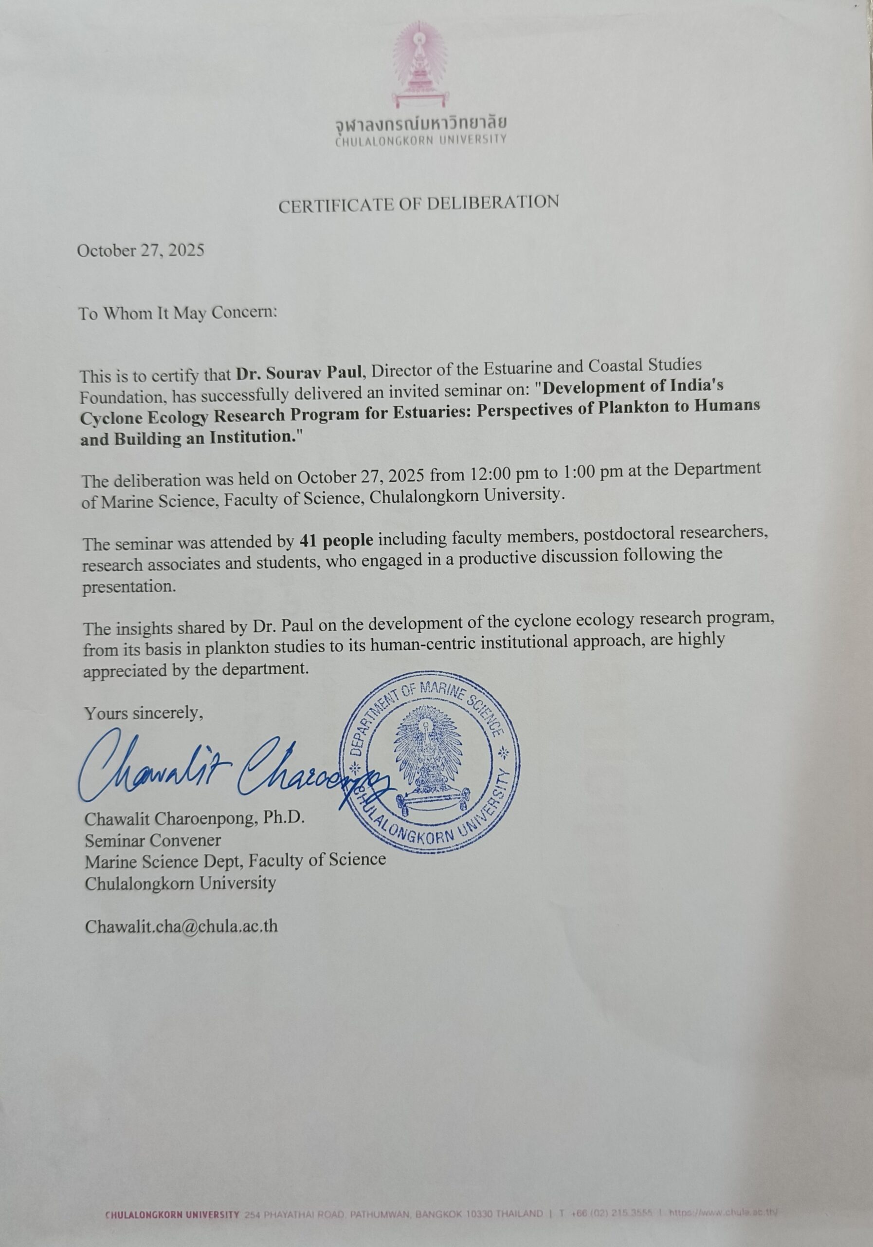 Congratulations to Dr. Sourav Paul (Director, ECSF) who delivered an invited lecture at Dept. of Marine Science, Chulalongkorn University, Bangkok, Thailand on 27 October 2025. Oplus_16908288