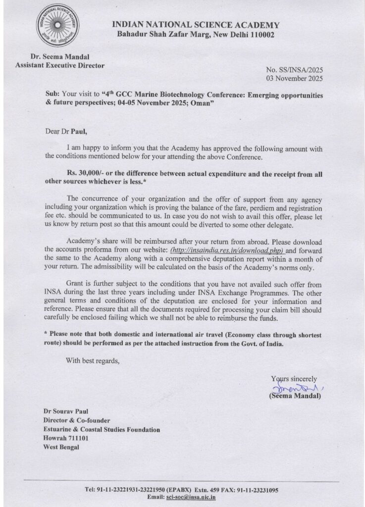 Congratulations to Dr. Sourav Paul (Director, ECSF) who was awarded the prestigious ‘INSA Travel Award’ for attending the 4th GCC Marine Biotechnology Conference between 4-5 November 2025 at Sultan Qaboos University, Muscat, Oman.